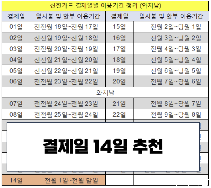 사용 기간이 두 달에 걸쳐 있어 지출 관리가 어렵기 때문인데요, 결제일을 14일로 설정하면, 전달 1일부터 말일까지 사용한 내역이 청구되어 월별 지출 관리가 용이해집니다. 또한 월단위로 혜택을 받기 위하여 실적을 채울 때에도 매달 1일부터 말일까지로 지정해두면 해당 기간에 얼마를 썼는지 파악하기가 용이합니다.