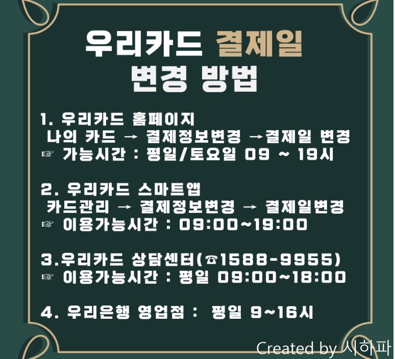 나의 card → 정보변경 →결제일 변경: 평일과 토요일 09:00~19:00