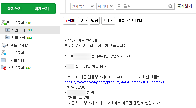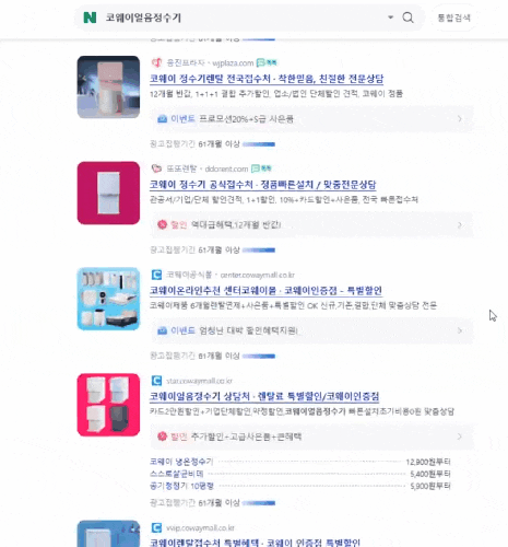 제가 업체를 찾은 방법은 네이버에서 코웨이 얼음 정수기로 검색을 해보면 여러 업체들의 광고 링크들을 볼 수 있는데요,