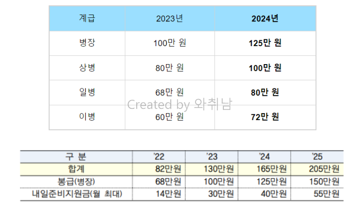 오늘은 2025 군인 병장과 상병, 이병, 일병 군인들의 월급 인상액을 각각 정리했습니다.